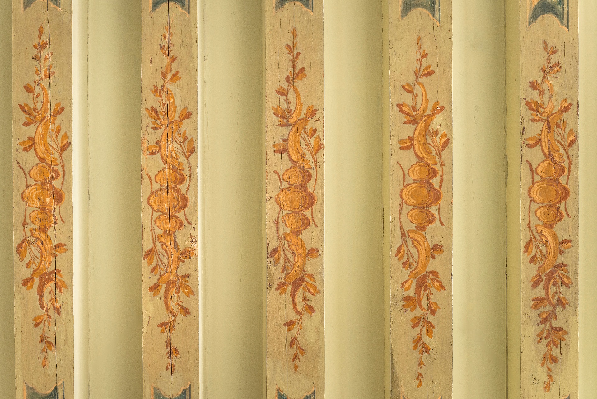 The two façades are very well proportioned. The front facade features a remarkable four-light window with a projecting balcony and two pairs of single-light windows, both within a dentilled frame. All the windows are lancet-arched with the classic late Gothic floret above.